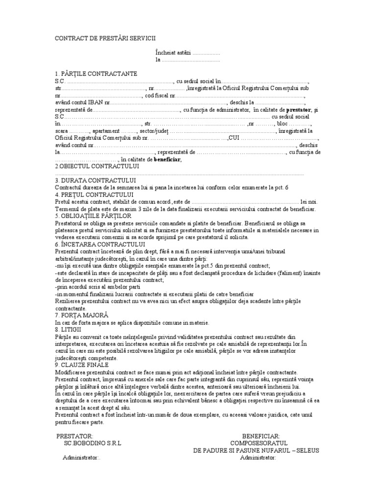 Descarcati gratuit cea mai buna varianta de statute, procuri ,contracte , imputerniciri, cereri , decizii,autorizatii,coduri, legi, ordonante 2015. Prestatorul va asigura beneficiarului urmatoarele servicii: Vezi coșul „contract de comodat a fost adăugat în coș. Este reglementat in raport de activitatile specifice (consultanta, turism, activitate de service, constructii, montaj, transport. Draft contract prestari servicii eurosistra cu botosani.